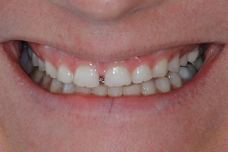 Patient smiling holding up a before photo of her teeth before dental procedure